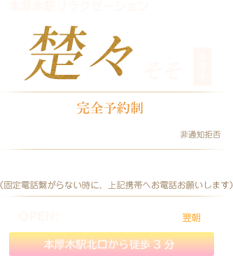 本厚木駅北口から徒歩3min、高級リラクゼーションエステSoSo 楚々